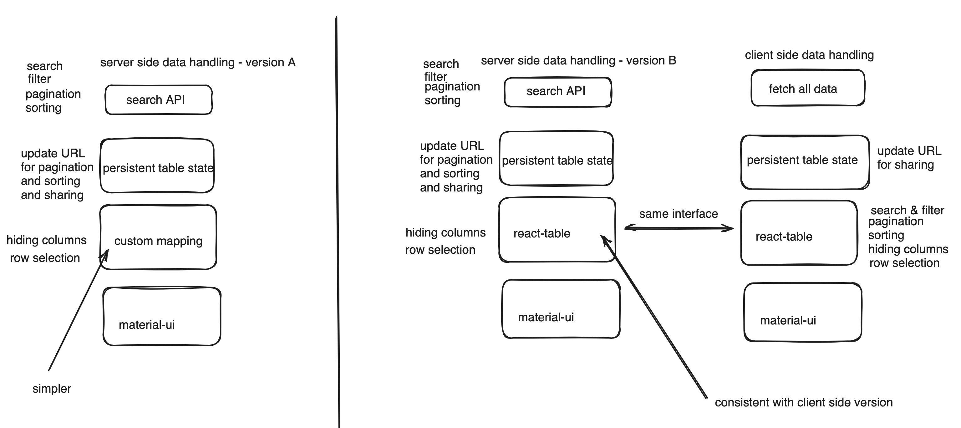For pages with no server data handling we need react-table for client side data handling. For pages with server data handling we considered two options that we implemented in a spike: